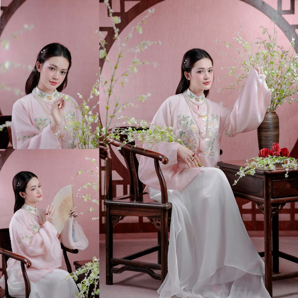 Gam hồng pastel kết hợp hoa xuân tạo nên vẻ dịu dàng, nữ tính. Concept mang hơi hướng tiểu thư hiện đại, trẻ trung nhưng vẫn giữ được sự sang trọng cần có trong ảnh Tết.