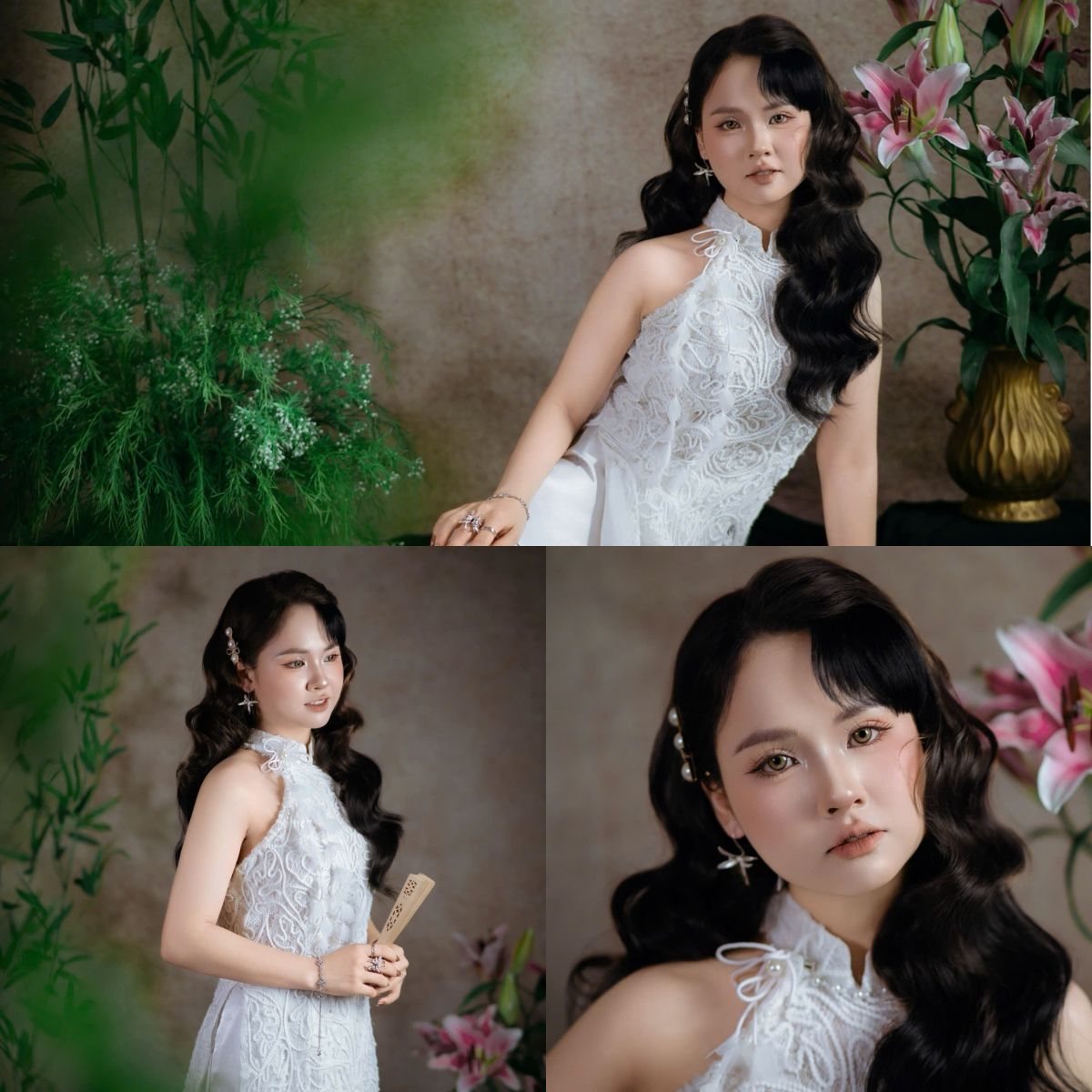 Phong cách tối giản với trang phục trắng, ánh sáng mềm và bố cục gọn gàng. Gương mặt là điểm nhấn chính, tạo cảm giác thanh lịch, trong trẻo và sang trọng. Concept phù hợp chụp Tết nhưng vẫn sử dụng làm ảnh chân dung quanh năm.